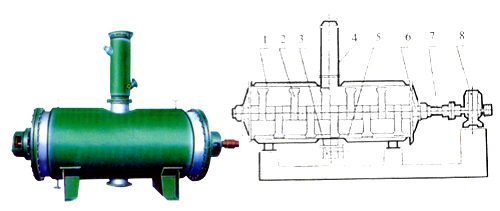 【真空耙式干燥機】 具有結(jié)構(gòu)簡單,操作方便,使用周期長,性能穩(wěn)定可靠,蒸汽耗量小,適用性能強,產(chǎn)品質(zhì)量好,特別適用于不耐高溫、易燃、調(diào)溫下易氧化的膏狀物料的干燥,該機經(jīng)用戶長期使用證明是一良好的干燥設(shè)備。原理:被干燥物料從殼體上方正中間加入,在不斷正反轉(zhuǎn)動的耙齒的攪拌下,物料軸向來回走動,與殼體內(nèi)壁接觸的表面不斷更新,受到蒸汽的間接加熱,耙齒的均勻攪拌,粉碎棒的粉碎,使物料表面水分更有利的排出,氣化的水分經(jīng)干式除塵器、濕式除塵器、冷凝器,從真空泵出口處放空。結(jié)構(gòu):真空耙式干燥機的主要部件